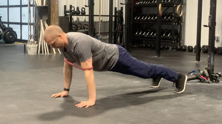 This banded variation does not involve using the pull-up rig, which is an added benefit for quick transitions and if the pull-up rig is being used for other movements. Fold a band in half and create a loop, then place your arms into the band. The difficulty of this exercise can be modified by raising or lowering the placement of the band on the arms. A potential pitfall of this exercise is that there may be some discomfort of the band rubbing against the skin of the arms.